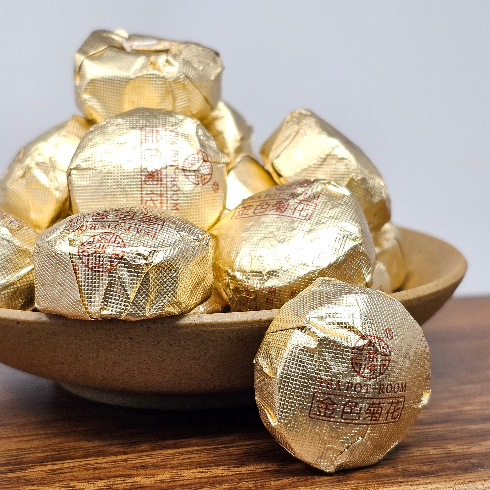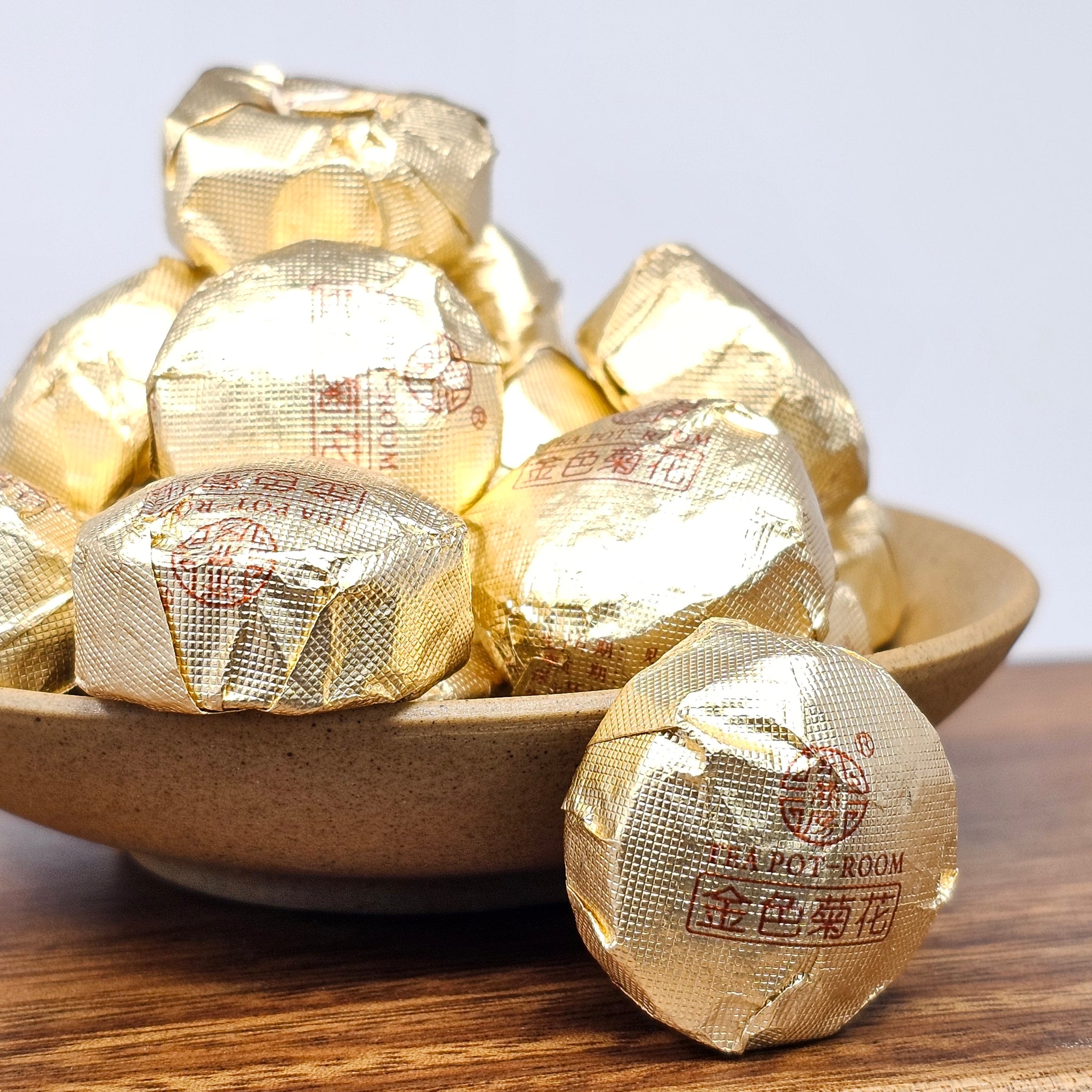 Cooked Puerh Tuocha pressed with Chrysanthemum flower. Roughly 5g apiece.